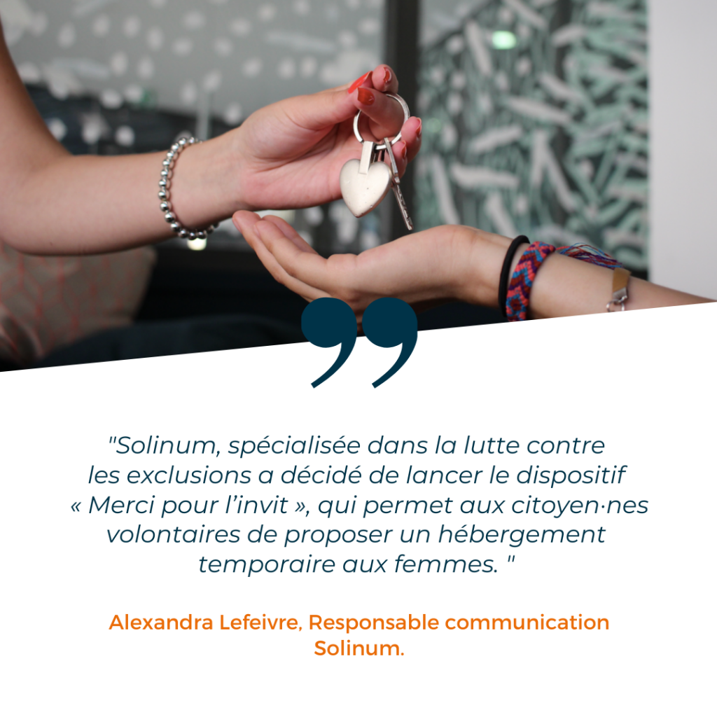 Face à cette situation, l’association Solinum, spécialisée dans la lutte contre les exclusions a décidé de lancer le dispositif « Merci pour l’invit », qui permet aux citoyen·nes volontaires de proposer un hébergement temporaire à ces femmes. Solinum considère que l’hébergement citoyen suivi et accompagné joue un rôle essentiel dans la réinsertion des personnes hébergées. Lors de la mise en place d'un hébergement, une charte établissant les règles de vie au sein du foyer est signée par l’hégergée et l’accueillant·e. La durée d’hébergement varie entre deux semaines minimum et un an.