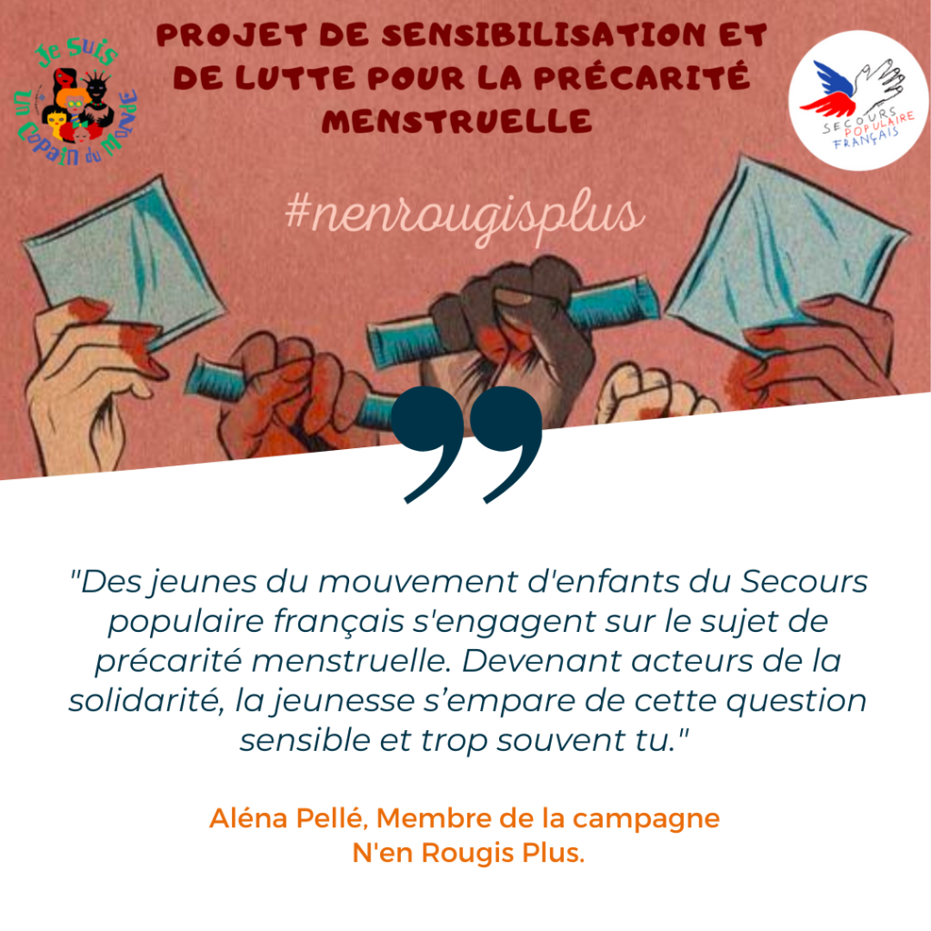 Les jeunes de "Copain du Monde" de la fédération 63 - mouvement d'enfants du Secours populaire français -, s'engagent pour venir en soutien aux femmes autour du sujet de précarité menstruelle. Devenant acteurs de la solidarité, la jeunesse s’empare de cette question sensible et trop souvent tu. 60 lycéens et lycéennes ont donc lancé en janvier 2021 une campagne nommée “N’en rougis plus”. Des affiches pédagogiques et des petites vidéos de sensibilisation ont alors été réalisées, en plus d’une participation en avril à une première émission radio de sensibilisation sur Radio Campus Clermont-Ferrand.