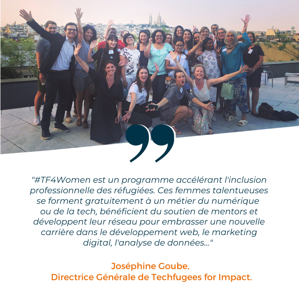 Techfugees for Impact est une association loi 1901 qui met en œuvre des programmes innovants favorisant l’inclusion des personnes réfugiées dans le monde. Depuis 2018, elle déploie le Pathway et le Fellowship #TF4Women afin d’accélérer l’inclusion professionnelle des femmes réfugiées dans les métiers de la tech et du numérique.
